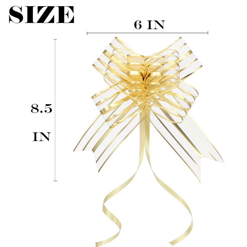 - Package: Each package include 10 gold gift bow, and their assembled diameter is 6 inch. Our holiday bows for presents are made from high quality materials to make the gold pull bows look elegant and charming after being assembled. The attractive color create a striking, eye-catching effect that can enhance the overall aesthetic of gifts or decorations