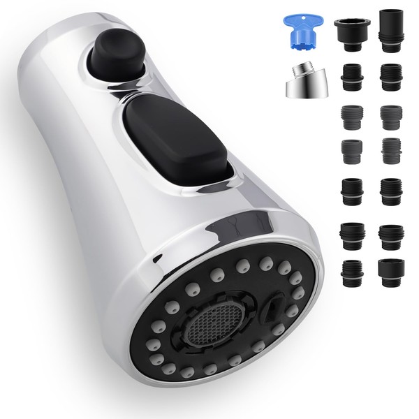 Universal Kitchen Faucet Head Replacement Compatible with Kohler/Moen/Delta Faucet with 15 Adapter Kit, 3 Function Pull Down Sink Faucet Spray Head, Chrome Finished