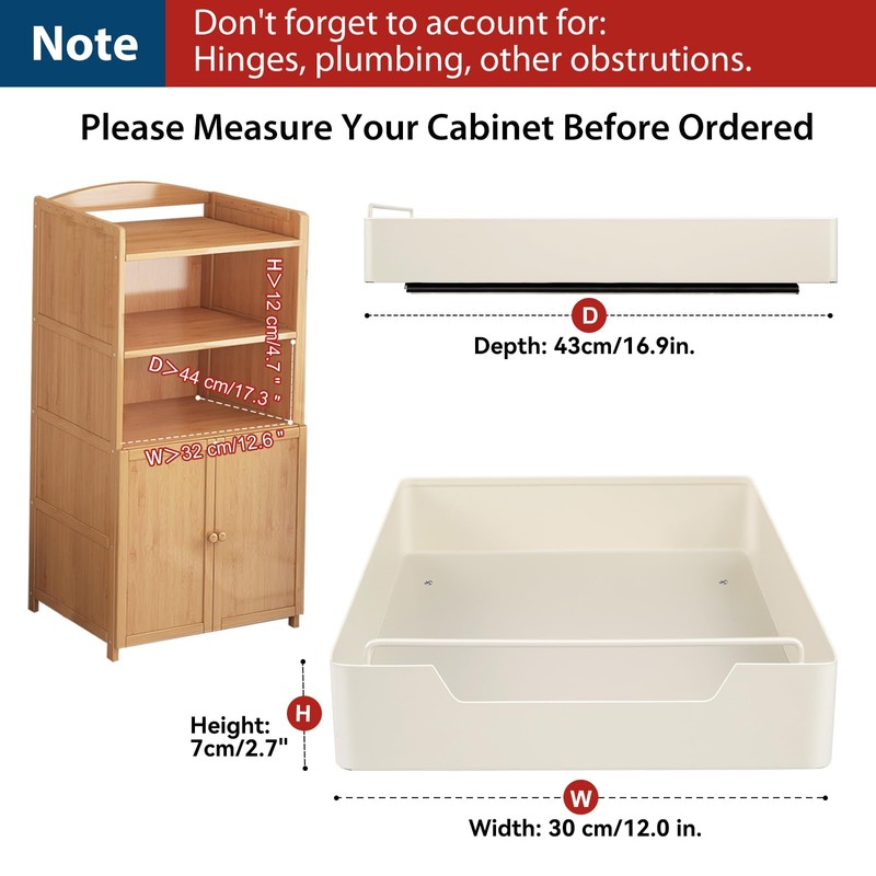 - (Pull-Out Home Organizers):This pull out drawer is only suitable for cabinets with Width exceeding 12" and Depth exceeding 16.9", Height exceeding 2.75''. Please confirm the dimensions of your cabinet before selecting the drawer.