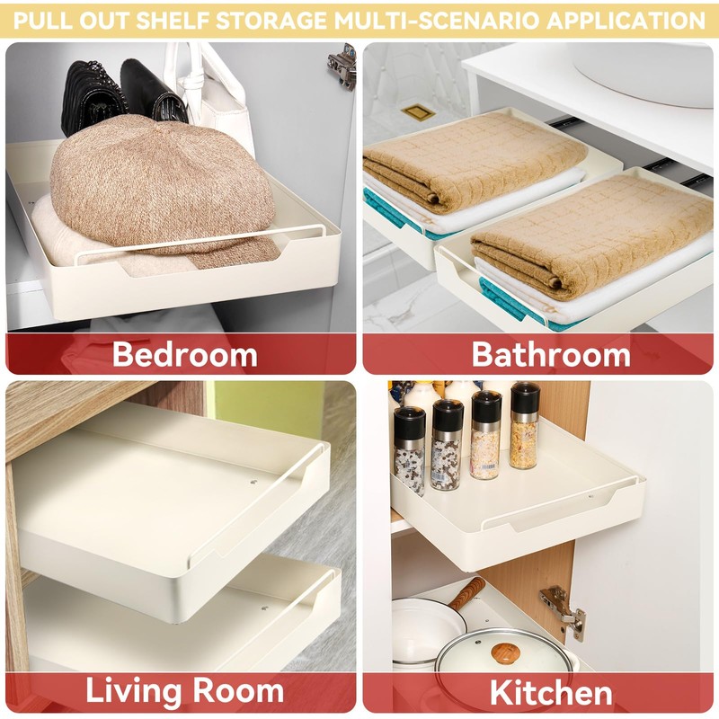 - (Mult-use): This cabinet organizer pull out drawer is perfect for containing and organizing items and keeping in neat. It is a great adhesive drawers for cabinets slide out smoothly for kitchen, pantry, bathroom, living room, office, and so on.