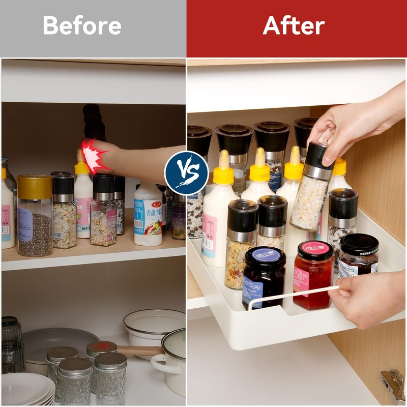 - (Quick Installation):Our cabinet organizer no need screws, drilling, or nails to install. What you need to do is tear off the nano glue and install it where you like. Slide out design is an perfect choice for deep cabinets in the kitchen or bathroom.