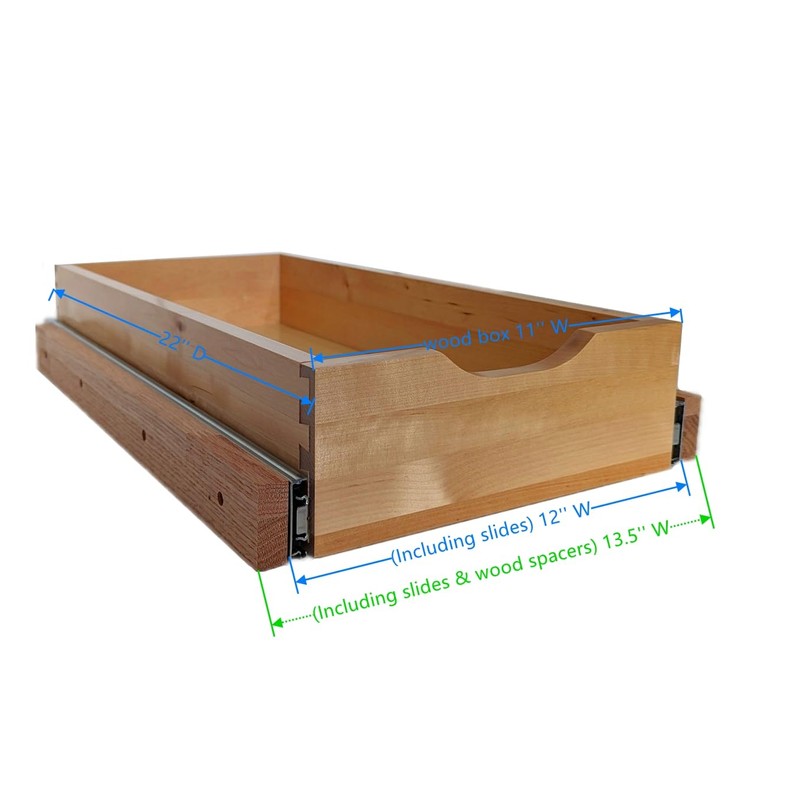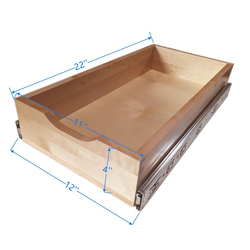 - 11" Wide Drawer (Total width 12") - 22" Depth, 4" Height This solid wood drawer offers a sleek design for organized storage. With a width of 11 inches, the addition of side tracks increases the total width to 12 inches, allowing for smooth operation.
