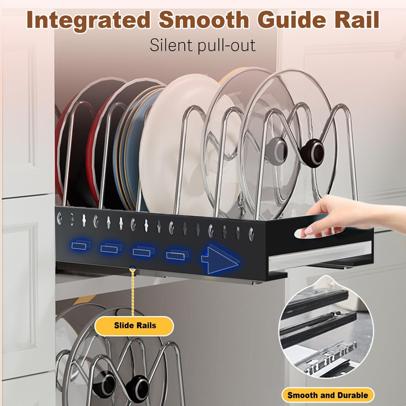 - 【𝐄𝐚𝐬𝐲 𝐏𝐮𝐥𝐥-𝐨𝐮𝐭 𝐃𝐞𝐬𝐢𝐠𝐧】When you need to grab the right lid, pan or pot, just give it a pull and slide out the lid organizer in the cabinet. the pots and pans organizer can easily organize and store pots, pans, and utensils, saving you time and trouble in the kitchen. There is a drip tray under the pot organizer rack,which can be catch the water to avoid cabinets wet.