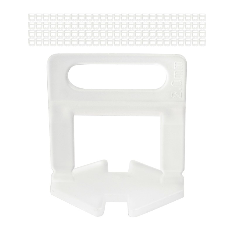 - Box contents: 100 x 2 mm thick tile levelling system, pull tabs, in transparent, made of plastic, suitable for tile laying indoors and outdoors.