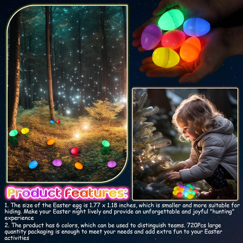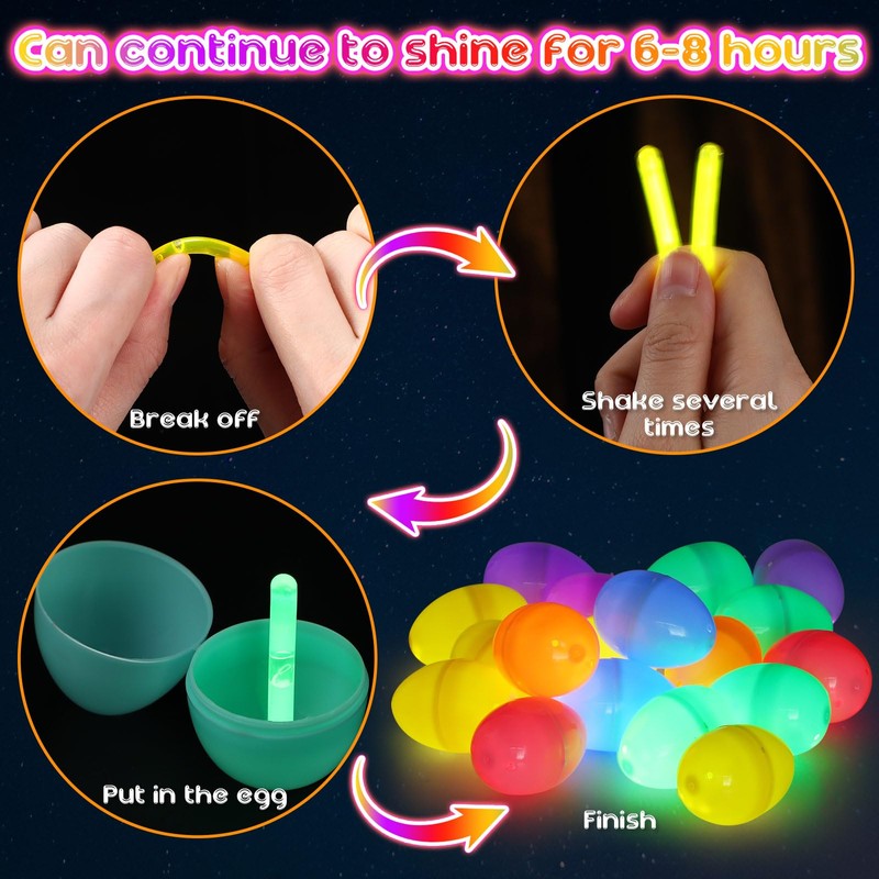 - Stealthily Designed for Concealment: the plastic eggs fillable in the set are specifically designed for a compact size of about 1.77 x 1.18 inches, while the mini glow sticks bulk measuring about 0.18 x 1.54 inches, ideal for hiding; Keeping them concealed will surely bring out the excitement and add a thrill to your Easter egg hunt games, making these activities a memorable experience for you