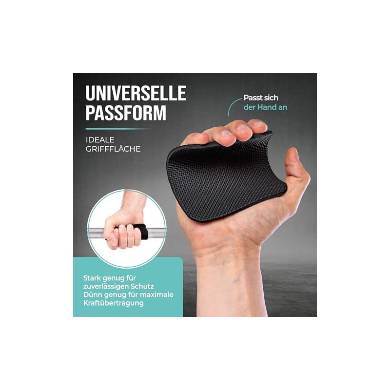 - Skin protection: The grip pads relieve pressure on the hands and protect against skin tears and calluses thanks to the large grip surface. Thanks to the low thickness of only 3 mm, you still maintain perfect contact with the bar or dumbbell for maximum power transmission.