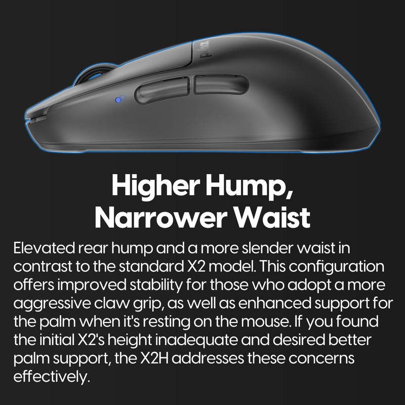 • Higher Hump Narrower Waist - Elevated rear hump and a more slender waist in contrast to the standard X2 mini model. Offers improved stability for those who adopt a more aggressive claw grip, as well as enhanced support for the palm when it's resting on the mouse.