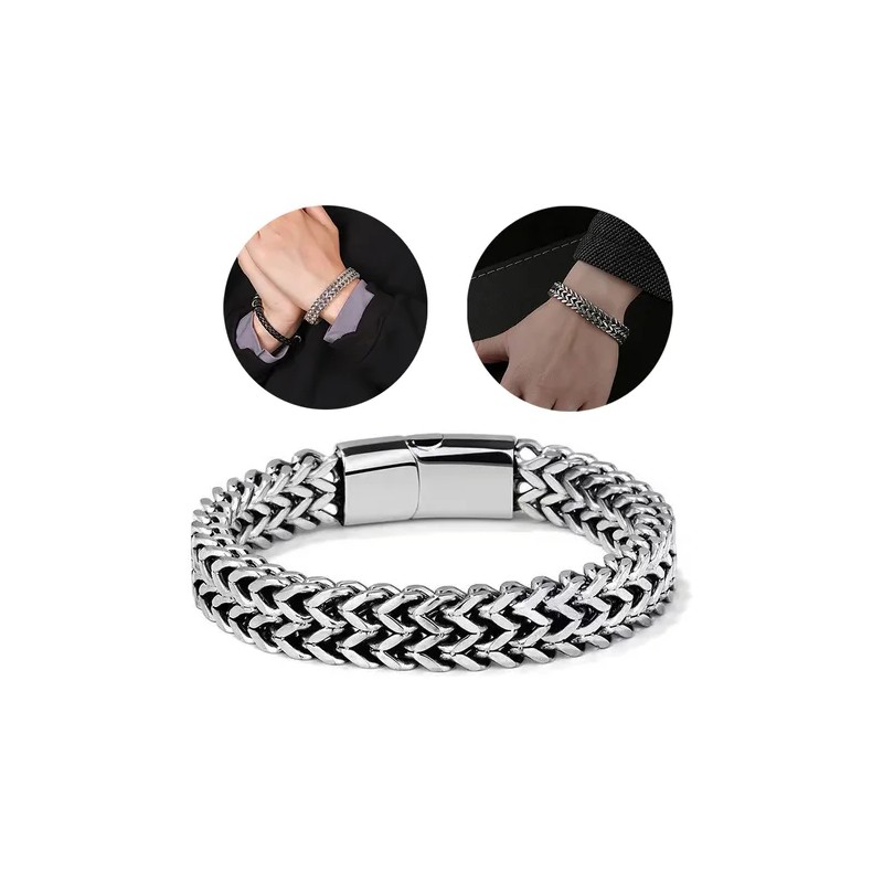 Este brazalete de caballero de diseño de cadena cuadrada doble, con un diseño de tejido parcialmente trenzado elegante, combinado con acero inoxidable y un broche magnético, de forma simple y generosa.