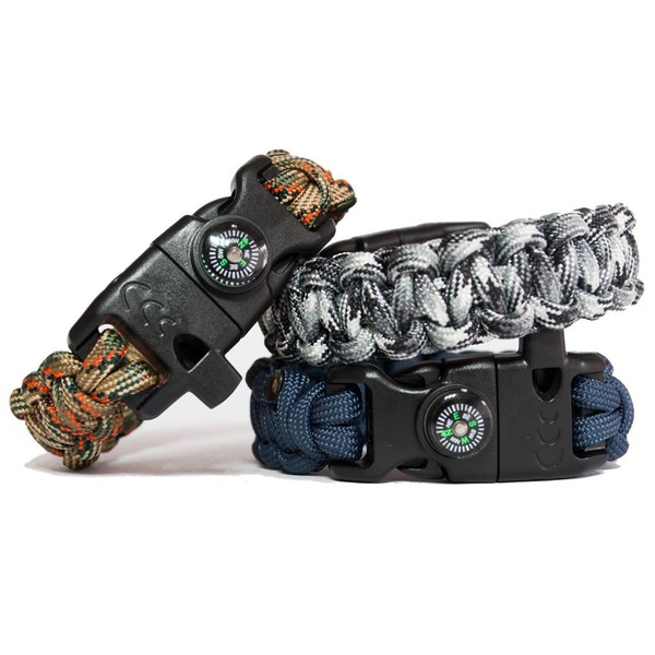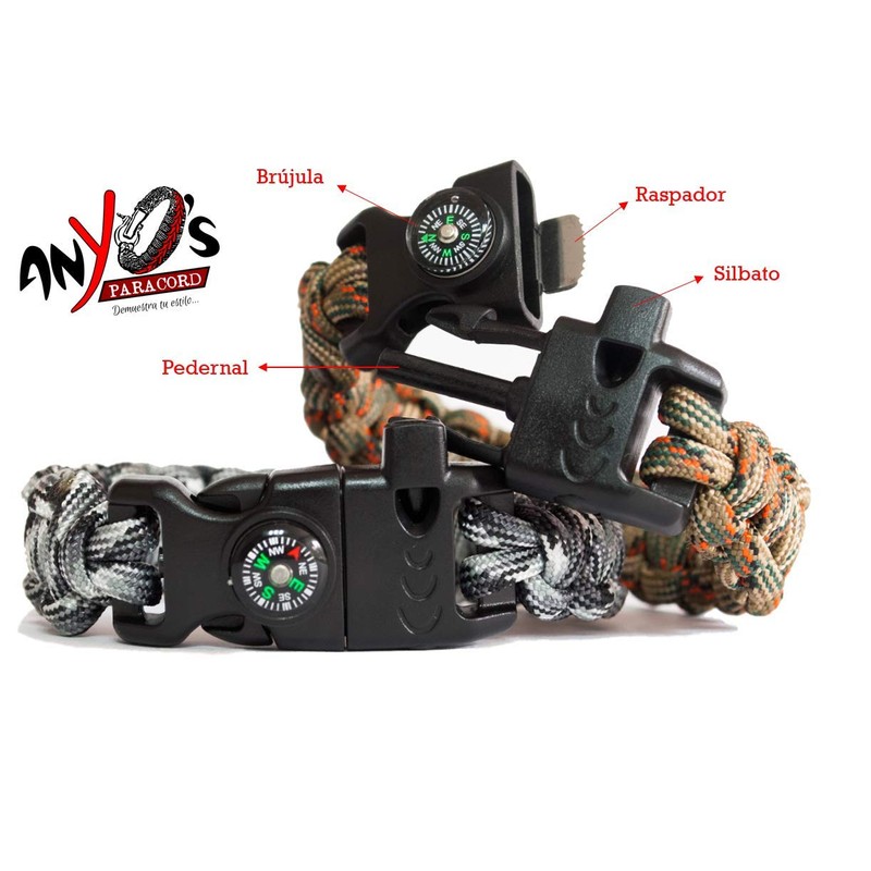 - Pulsera elaborada con broche de supervivencia que incluye: Brújula, silbato, pedernal (iniciador de fuego) y raspador para activar el pedernal (aunque también puede usarse como una pequeña navaja).