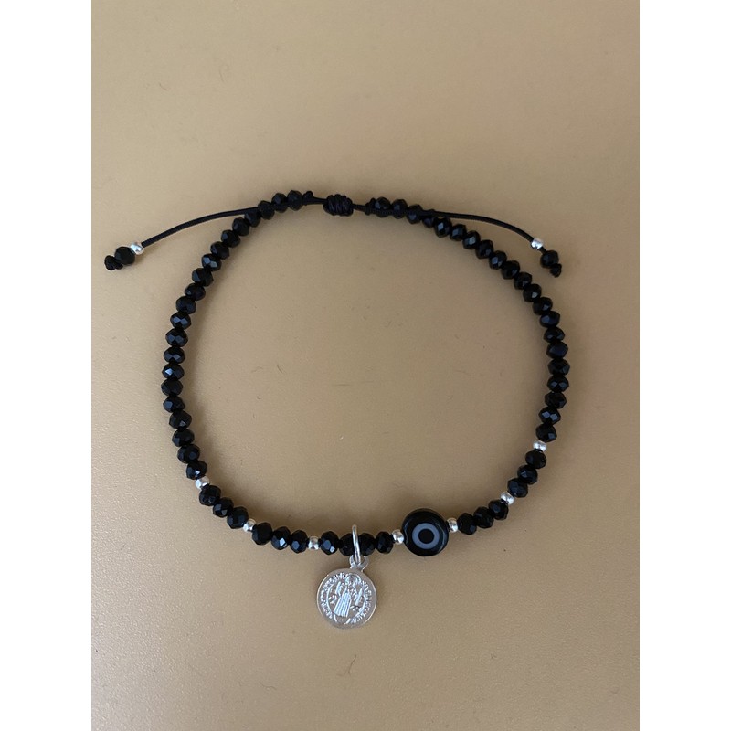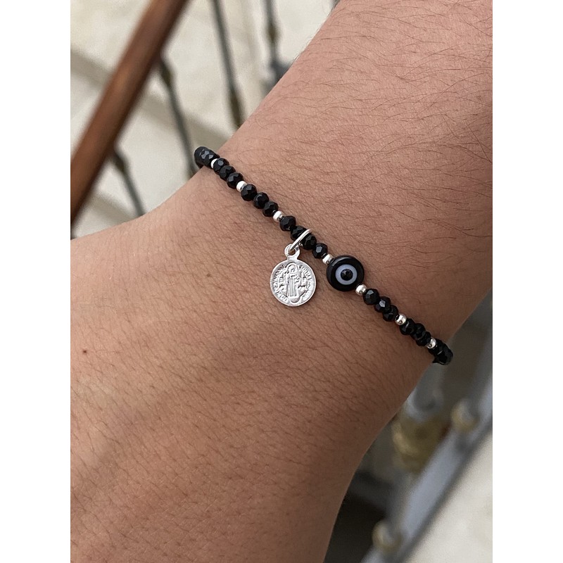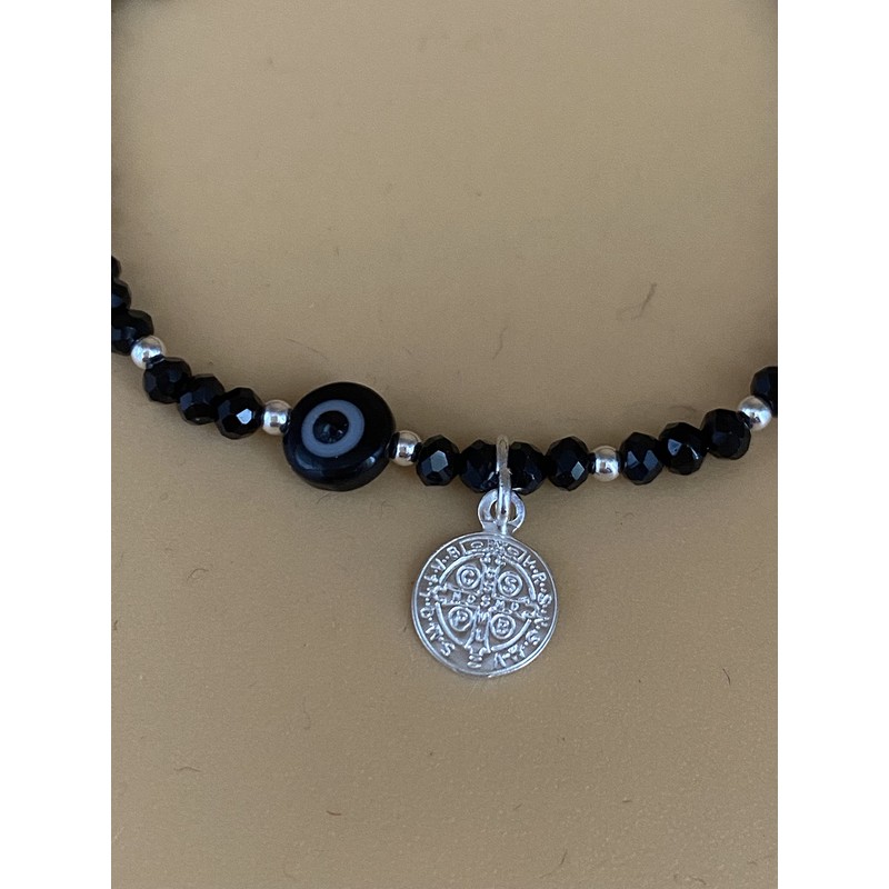 - ⛓️ PULSERA - Brillante, distinguida, cómoda y ajustable es lo que describe a la perfección esta pulsera de Ojo Turco y medalla de San Benito de plata que está confeccionada de cristales negros y bolitas de plata certificada, es perfectamente combinable con cualquier estilo de prenda que vistas.