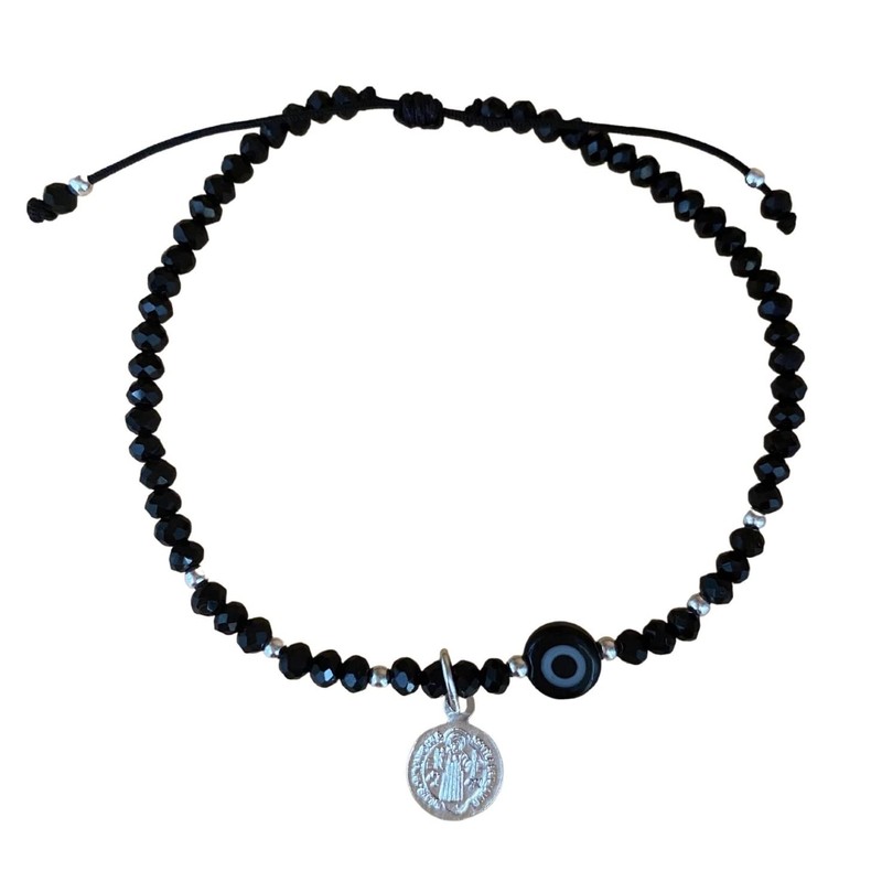 Pulsera Ojo Turco y Medalla de San Benito de Plata. Ajustable, plata 925 certificada y cristales negros. Ojo protector (NEGRO). Pulseras mujer o pulseras hombre. Joyería. Regalos para Mujer o Regalos para Hombre, de Cumpleaños, Día de San Valentín, Anive