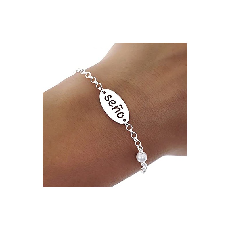 Pulsera Plata Ley 925m Cadena Seño Rolo 17 cm Profe Detalle Perla Chapa Oval, Pearl