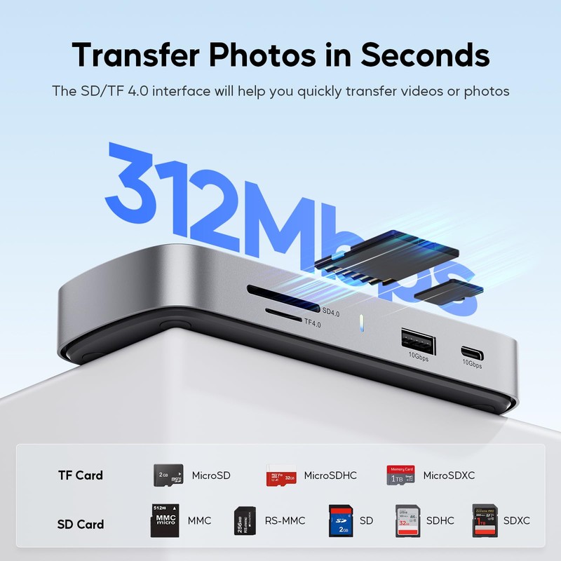 - 【SD/TF 4.0 de alta velocidad】La estación de acoplamiento tiene las últimas ranuras para tarjetas SD USH-II (312 Mb/s, que puede una velocidad de transferencia de hasta 312 Mbps. Es aproximadamente 3 veces mayor que SD3.0 (USH-I 104Mb/s), lo que le permite hacer copias de seguridad de archivos y videos de gran tamaño rápidamente y garantizar que nunca se pierda un momento de creatividad. Tipo de tarjeta: MMC, RS-MMC, micro SDXC, micro SDHC, micro SD, SDXC, SDHC, UHS-1, tarjeta SD, *Nota: asegúrate de que tu tarjeta SD admita transferencia de alta velocidad