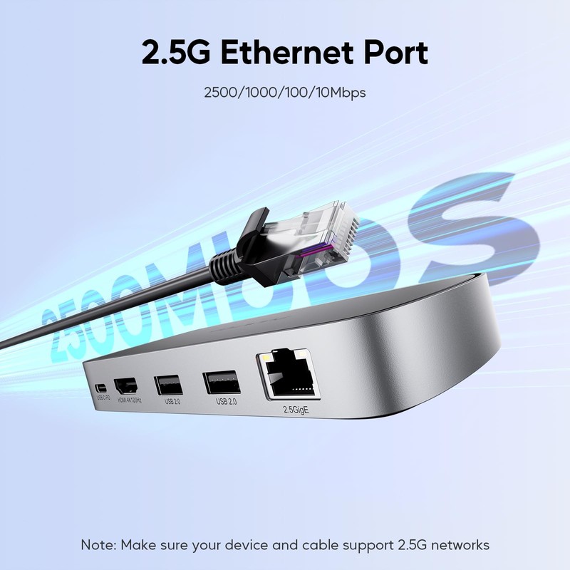 - Red de 2.5 Gigabit y USB 2.0: la base portátil Mini USB C soporta un máximo de 2500 Mbps, mejora la velocidad de red de tus dispositivos hasta 2.5 Gbps, 2.5 veces más rápido que 1 Gbps normal. También es compatible con versiones anteriores con 1000/100/10Mbps. También viene con 2 puertos USB 2.0 para conectar un teclado, mouse u otros periféricos conectados a USB A sin ningún retraso.