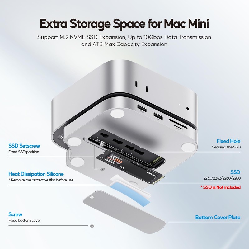 - SUPPORTS M.2 SSD EXPANSION - The Mac Mini M4 2024 hub stand supports up to 4TB/10Gbps M.2 PCIe NVMe external hard drive expansion, perfect for the mac mini m4 users who needing additional storage without compromising speed or efficiency. Support PCIe M.2 SSDs in size of 2242/2260/2280. NOTE: 1). SSD is NOT included; 2). DOES NOT support SATA SSDs; 3) Please format your new SSD in exFat format before use