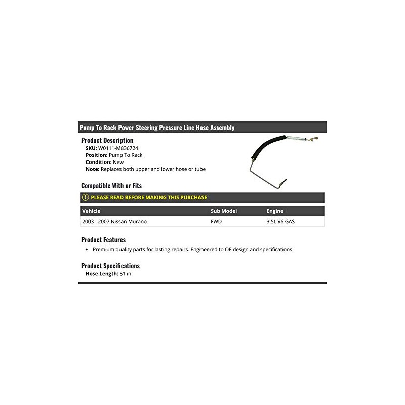 Pump To Rack Power Steering Pressure Line Hose Assembly - Compatible with 2003-2007 Nissan Murano FWD 3.5L V6 GAS