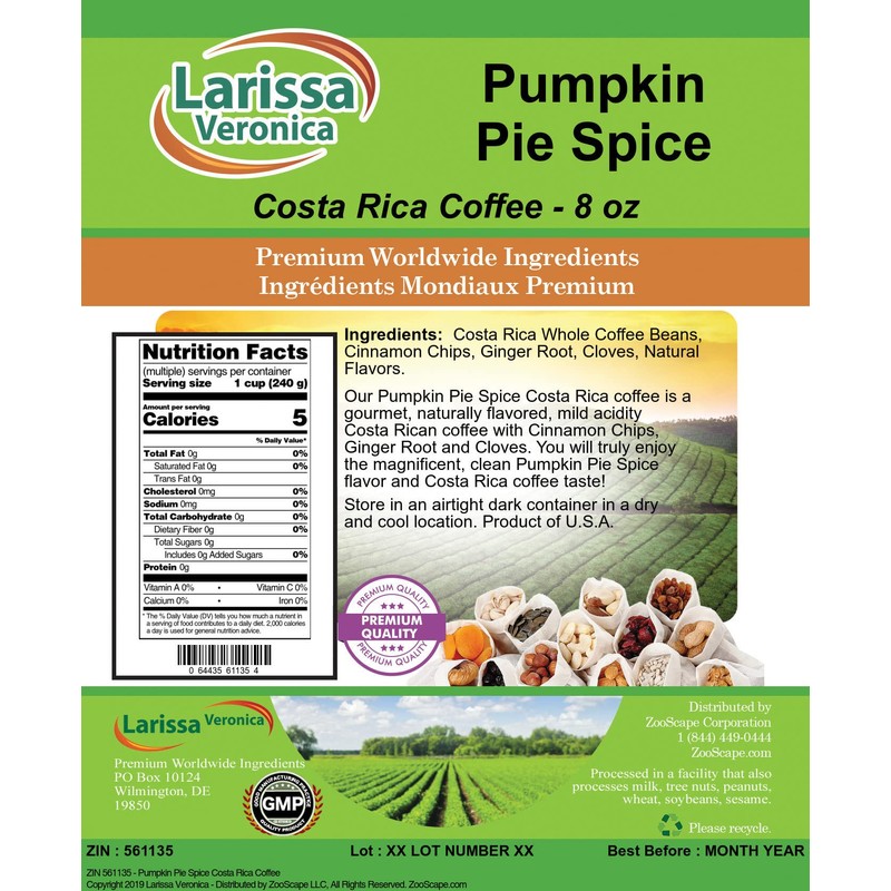 - Our Pumpkin Pie Spice Costa Rica coffee is a gourmet, naturally flavored, mild acidity Costa Rican coffee with Cinnamon Chips, Ginger Root and Cloves. You will truly enjoy the magnificent, clean Pumpkin Pie Spice flavor and Costa Rica coffee taste! - Ingredients: Costa Rica coffee (whole coffee beans), Cinnamon Chips, Ginger Root, Cloves and Natural Pumpkin Pie Spice Flavor.
