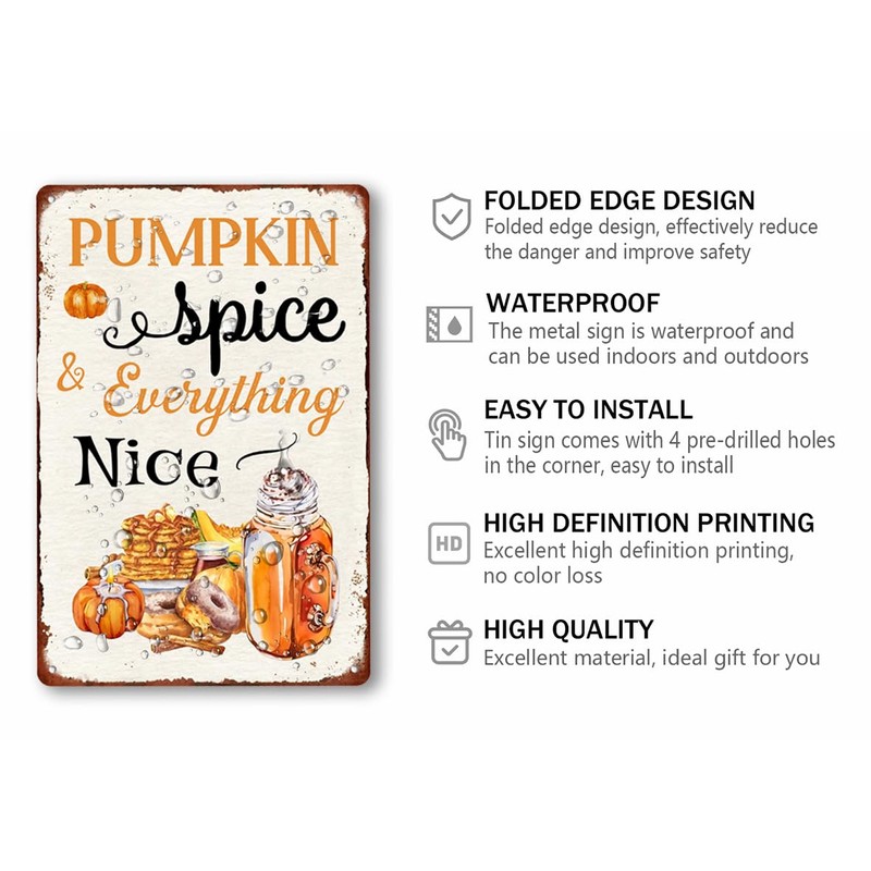 Pumpkin Spice and Everything Nice Metal Tin Sign Fall Art Kitchen Fall Print Coffee Art Decor for Home Bar Thanksgiving Wall Decor 8x12 Inch