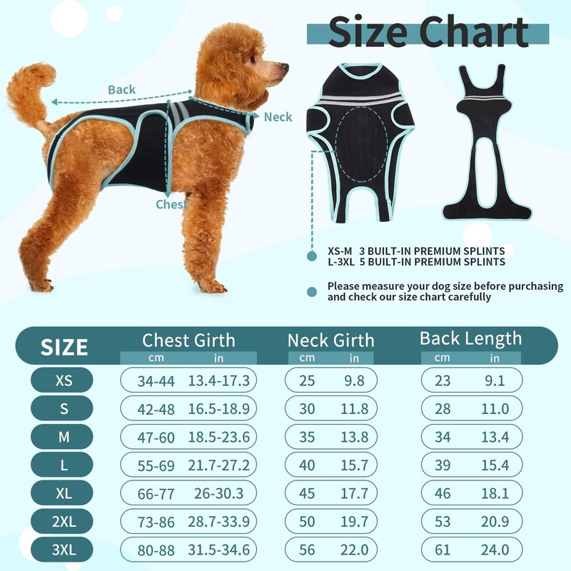 - Leash Hole: There is a leash hole on the back for walking the dog. The XS, S and M sizes feature three support bars, while the L, XL, 2XL, 3XL sizes boast five bars. The dog back brace for slipped disc is available in seven sizes to meet the needs of more dogs, please measure your pet's size before purchasing and choose the right size.