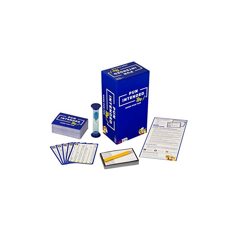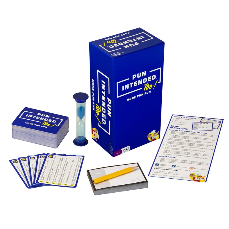 - SAME GAME AS PUN INTENDED WITH NEW FUN PUNS | Like the retired soprano, we could have left on a high note after making Pun Intended. Pun Intended Too! brings new puns and jokes, but like drying cement these puns are a little harder. Play in groups or as individuals. It's sure to be a group favorite.