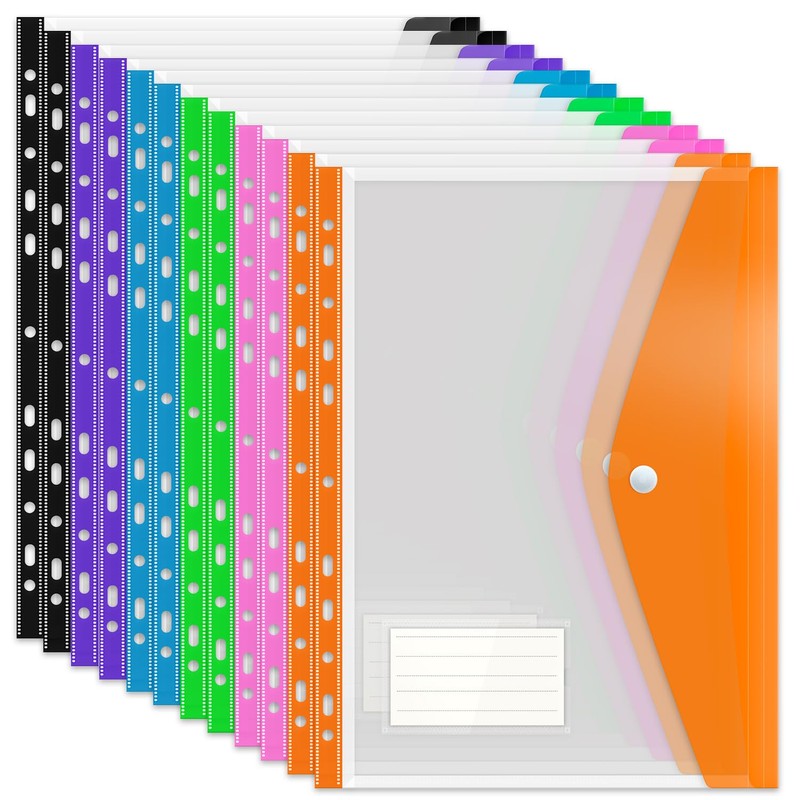 Punched Pockets Plastic Wallets, 12Pcs A4 File Folders for Document Paperwork Clear Assorted Coloured Envelope with Label Pocket Snap Button Ring Binder Home School Office Supplies
