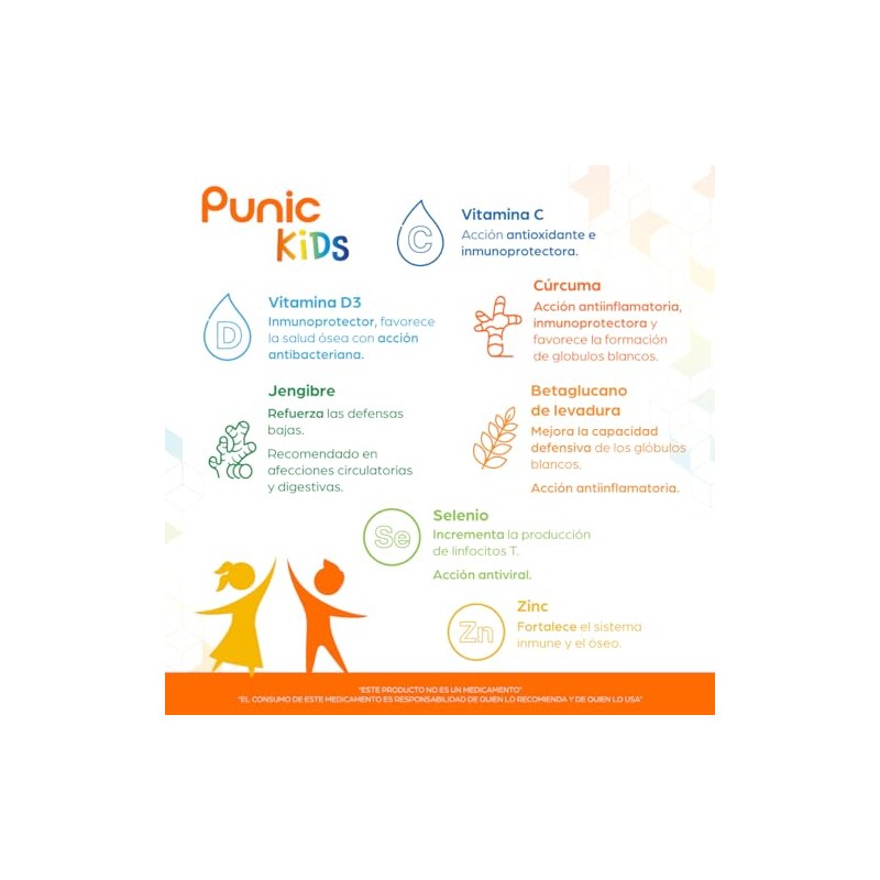 - 𝗦𝗶𝗻𝗲𝗿𝗴𝗶𝗮 𝗱𝗲 𝗜𝗻𝗴𝗿𝗲𝗱𝗶𝗲𝗻𝘁𝗲𝘀: Punic Kids se destaca por su fórmula única que combina ingredientes clave Vitamina C, Vitamina D3, Jengibre, Cúrcuma, Betaglucano de Levadura, Selenio, Zinc, que trabajan en sinergia para el sistema inmunológico de los más pequeños.