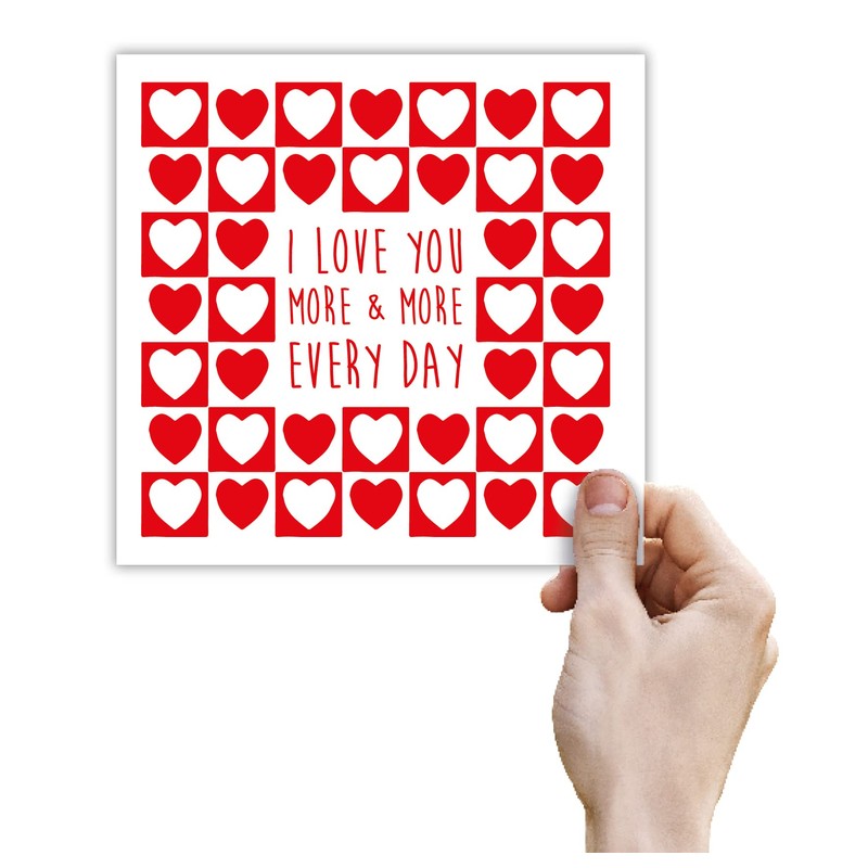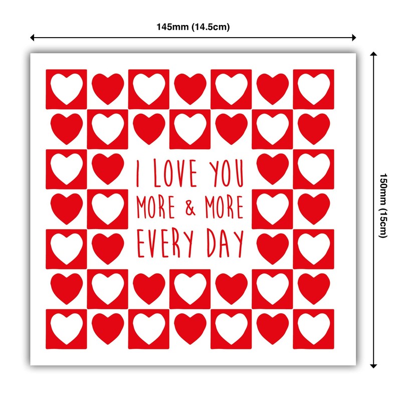 - Express your deepest affection with our 'Love You More' Valentine's Day card. This elegantly designed square card features a pristine white backdrop adorned with radiant red hearts, capturing the essence of love in its purest form. The heartfelt message 'Love You More' beautifully printed on the front encapsulates the depth of your feelings for that special someone.