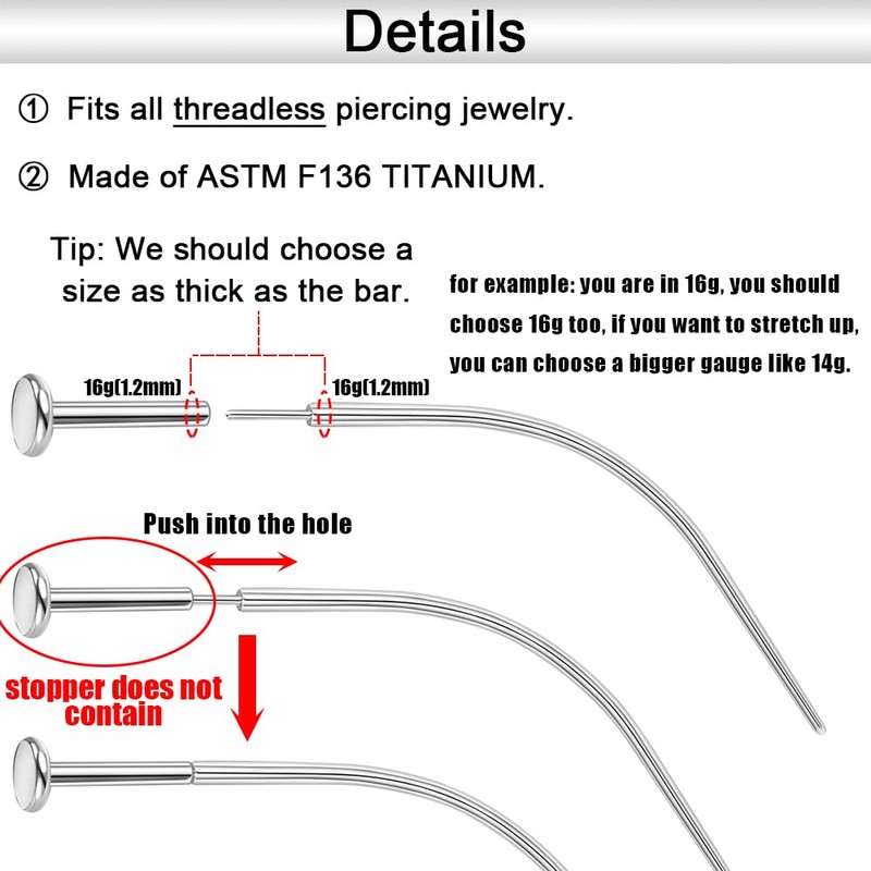 - ✿[Usage]:①, stretch your piercing to bigger size - 20g to 18g/16g/14g. ②, Assist in guiding threadless TRAGUS HELIX EARRINGS through your piercing much more easily. ③, Assist in guiding threadless NOSE STUDS NOSTRIL PIERCING through your piercing much more easily. ④, Assist in guiding threadless LIP PIERCING JEWELRY through your piercing much more easily.