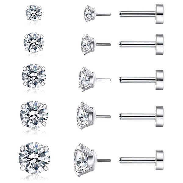 PunkTracker 5 Pairs Threadless Cubic Zirconia Stud Earrings for Women Men Hypoallergenic Flat Back Surgical Stainless Steel Cartilage Helix Conch Tragus Earrings, 2-6mm