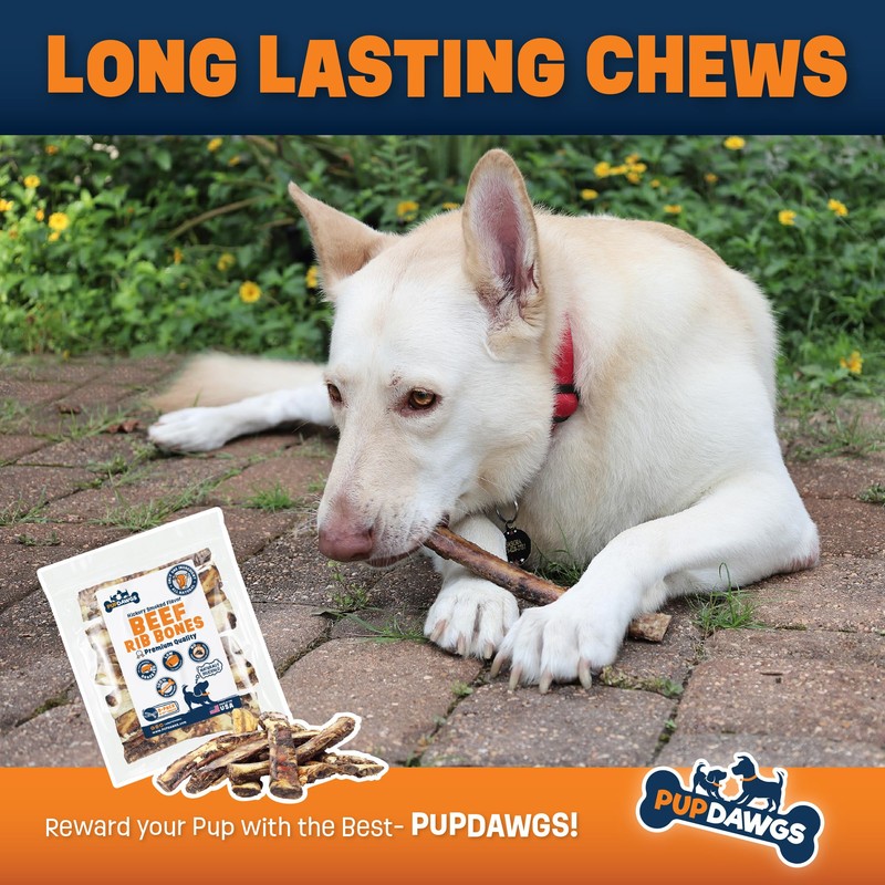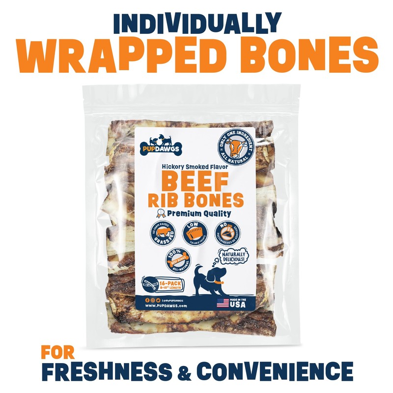 PUPDAWGS Single Ingredient Dog Bones - Made in USA – 8-10” Beef Rib Bones - Natural Dog Bones for Aggressive Chewers - from USDA Inspected Beef - Hickory Smoked - Individually Wrapped (16 Piece Pack)
