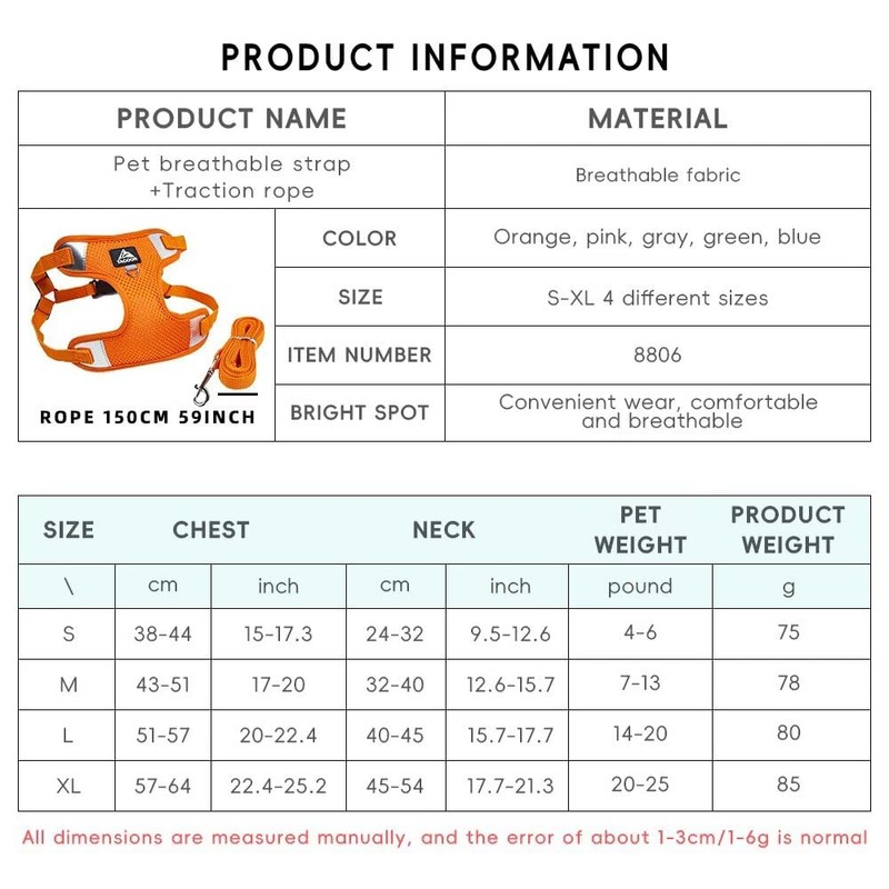 - 【Super Light Weight And Breathable】: Mesh harnesses are soft, lightweight and breathable, superior in comfort as compared to nylon and polyester fabrics; This comfortable dog harness will keep your pet cool and ventilate