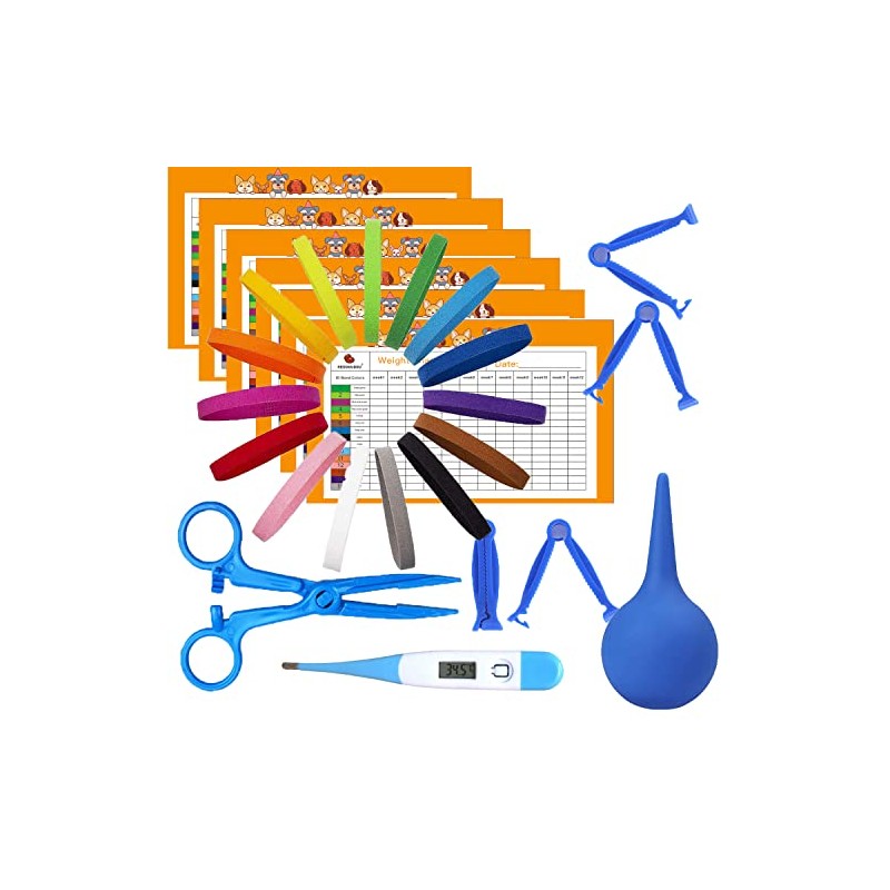 • Puppy Kitten Whelping Kit includes 15 x puppy ID bands, 6 x record keeping charts, 15 x cord clamps, a digital thermometer, a bulb aspirator, a forceps.
