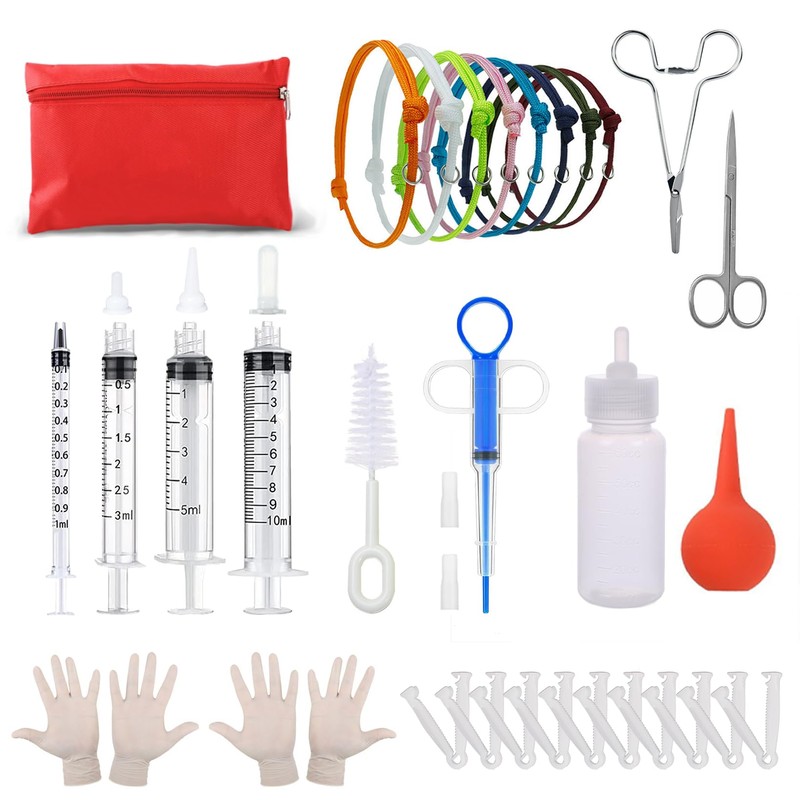 - Items Your PET Needs, in One Package: this puppy and kitten whelping kit has the items for newborn puppies and kittens with 4 puppy feeding tubes, 1 kitten baby bottle, 3 pet nipples,1 piercing pin,1 bottle cleaning stick,2 pairs of disposable gloves,8 puppy whelping collars, 1 pair of scissors, 1 Hemostatic Forceps,10 umbilical cord clamps, 1 bulb syringe, 1 red storage bag.This is a good combination of simple and convenient to help your newborn kitten and puppy with their whelping needs.