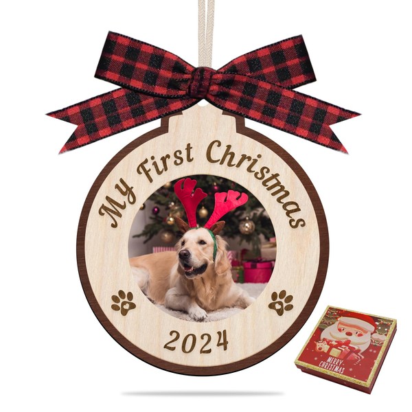 Puppy’s My First Christmas Picture Frame Ornament 2024,Custom Wooden Pet Name Ornament,Hanging Creative Christmas Tree Decorations with Bows and Gift Boxes (Wood 1)