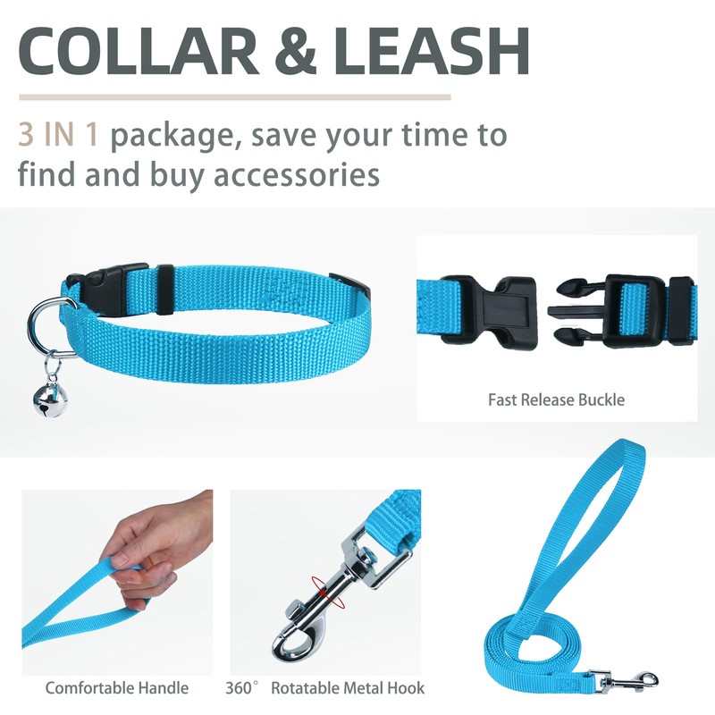 - DOG HARNESS, COLLAR & LEASH: - The package includes three items, a walking harness, a collar, and a 4.9ft matching leash. The collar is with bell, the leash is equipped with a 360-degree rotation metal hook, and the harness is adopted with a quick-release buckle and double D-rings which are very heavy-duty. You don't need to spend extra time looking through other accessories, but you get all of these items at the same time with less money! So this is a very cost-effective set
