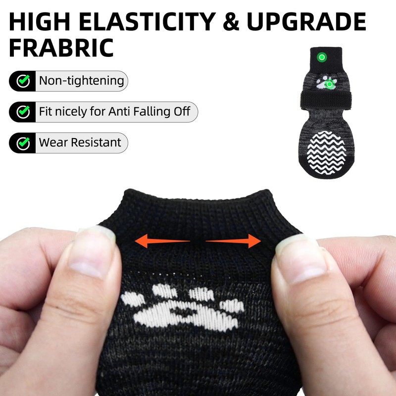 - Anti-Fall Off: Dog socks falling off is a concern for many owners. Therefore, we have designed the dog socks with a tightening band, as well as an elasticized cuff. There are also magic strips to easily adjust the elasticity so that the dog socks always stay on the dog's legs and won't fall off even when running. But don't fix it too tightly, makes your dogs feel good.