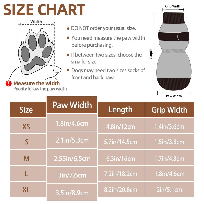 - Sise Matters - 3-inch paw width for Size Large. Please measure the dog's paws & reference our size chart before purchase. Choose the smaller size if between the two sizes. We have a total of five sizes for choice (XS-XL), fit for many pets. Including 2 pairs of dog socks in 8 colors for your choice, suitable for both boys and girls