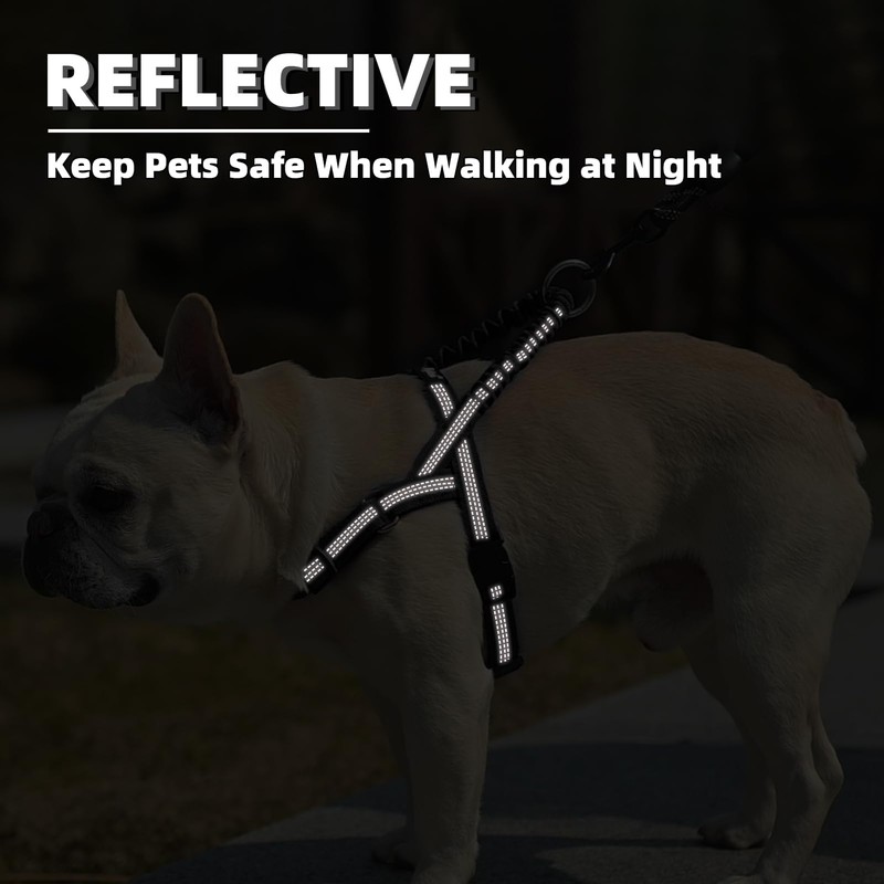 • NO PULL & NO CHOKE: A unique triangular design on both sides distributes pressure evenly throughout your dog's body. The elastic handles attached to the D-ring on the dog's back make the harness combination effective against pulling
