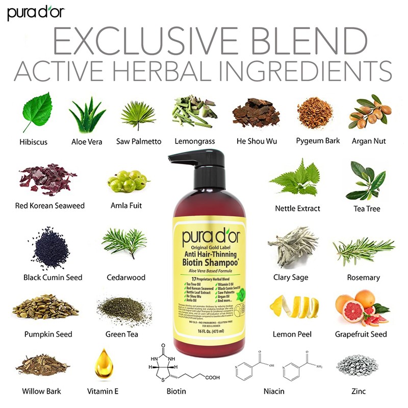 PURA D'OR Original Gold Label Anti-Hair Thinning Shampoo (and Conditioner) is formulated with 17 Top Rated Key Active Ingredients that promote stronger, cleaner, healthier hair. Hand selected botanical ingredients, such as Argan Oil, Red Korean Seaweed, Saw Palmetto, He Shou Wu and Nettle Extracts, add shine and help strengthen hair by increasing thickness while reducing the appearance of hair thinning and breakage. Our shampoo is gentle containing natural preservatives, especially for those with a sensitive scalp or even treated hair. All PURA D'OR products are cruelty-free and made without any parabens or sulfates. PURA D'OR is produced and bottled in a renewable energy source facility in Southern California.