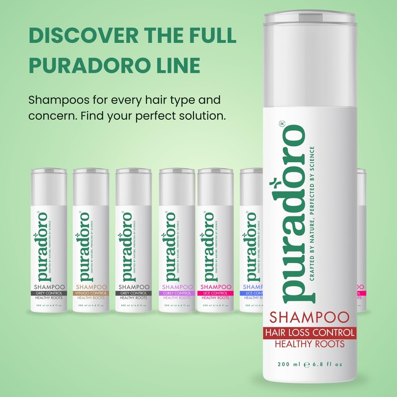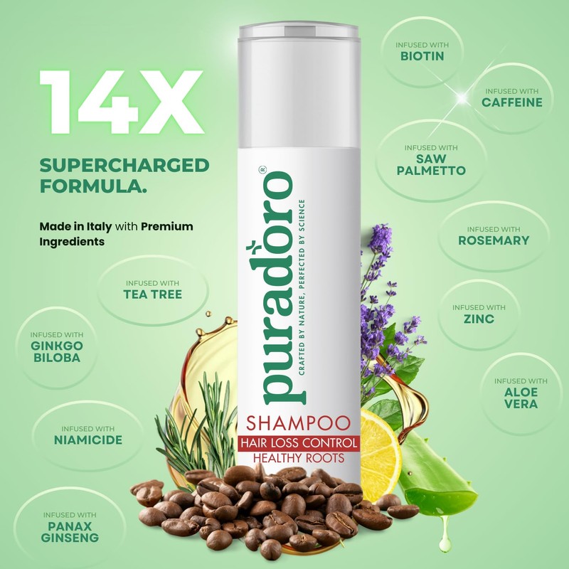 Puradoro Hair Loss Control & Healthy Roots Shampoo – Herbal Essence, Infused with Essential Oils, Biotin, Caffeine, Rosemary, Tea Tree, DHT Blocker for Hair Growth & Thicker Hair, For Men & Women