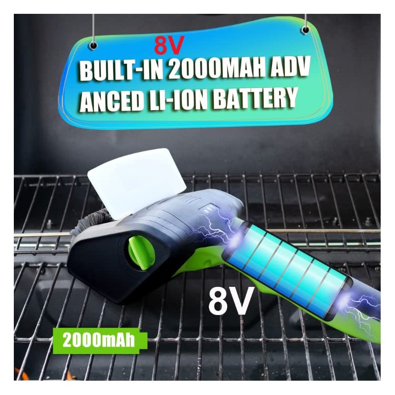 - 3X Faster Cleaning Will you feel Tired of cleaning your dirty grate? PURAMI Electric Grill Brush will definitely make your grill cleaning easier. With 360 high-speed rotating brush head, packed full of rust-proof stainless steel bristles, it quickly remove every bit of burnt on residue on the top, edges and corners of your grill but requires very little effort. Powered by DC8V, 2000mAh Li-ion Battery, it can work for more than 60mins continuously.