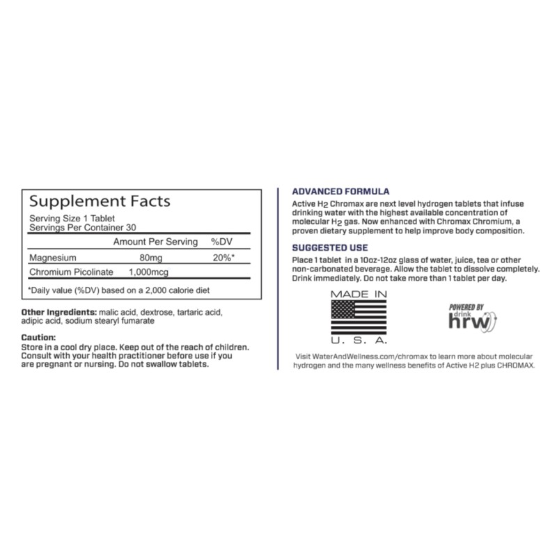 - NATURAL AND EFFECTIVE Active H2 + Chromax is not synthetically or chemically engineered. The blend of minerals works seamlessly together to provide faster results without added stimulants or supplements; Decreases blood sugar levels, bad cholesterol levels, levels of inflammatory markers making you feel more energized throughout your day.