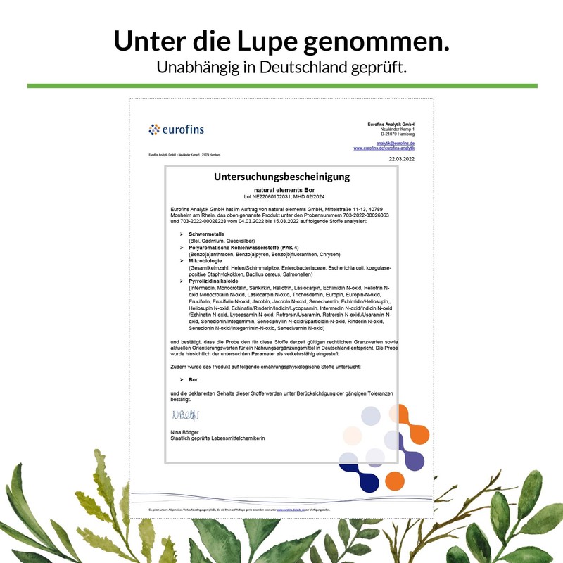 - Independently laboratory tested: our vital substance boron has been strictly tested by an accredited German laboratory (DIN EN ISO/IEC 17025). For the highest quality and satisfaction.