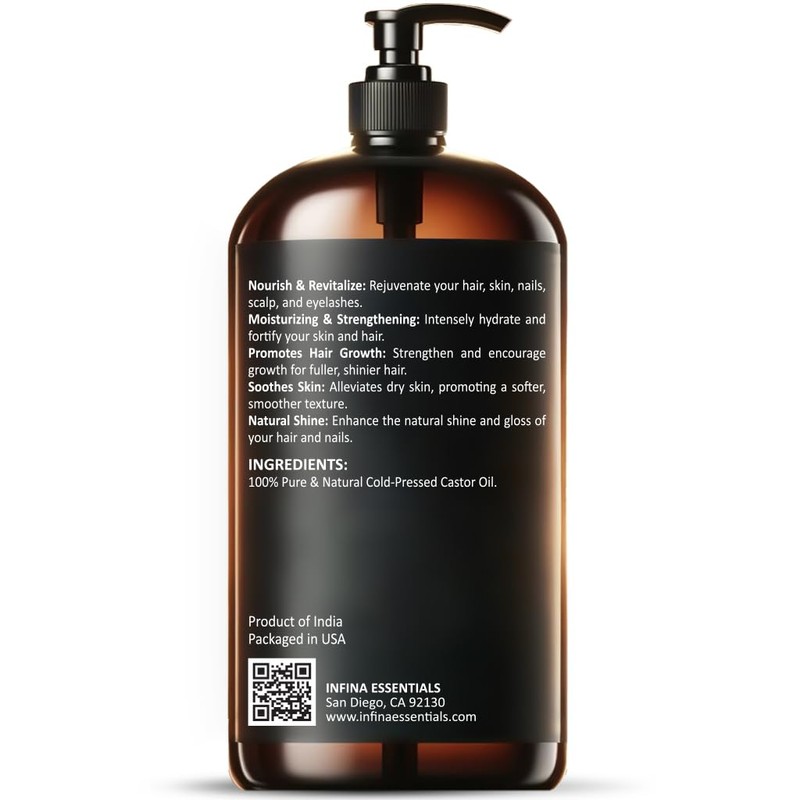 INFINA ESSENTIALS Pure Cold Pressed Castor Oil - Hexane Free, Glass Bottle for Hair Growth, Face, Scalp, Skin & Eyelashes - Nourishing and Moisturizing - 16 fl oz