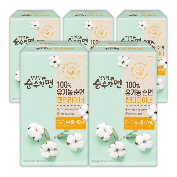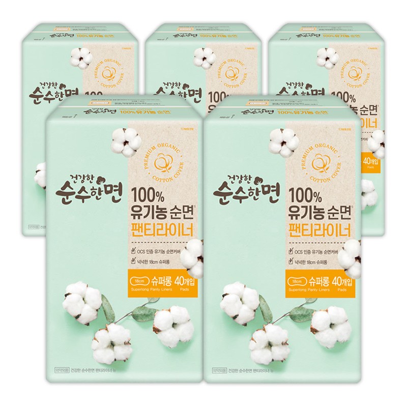 Pure Cotton Clean Country Healthy Pure Cotton Organic Super Long Panty Liner 36+4p 5 Packs / 순수한면 깨끗한나라 건강한 순수한면 유기농 슈퍼롱 팬티라이너 36+4p 5팩