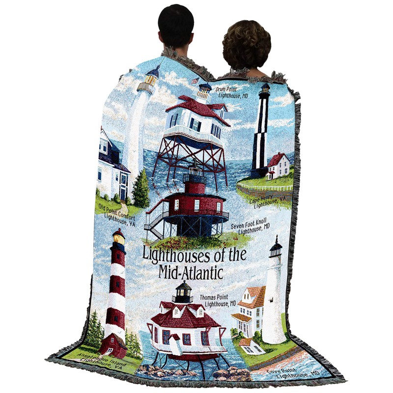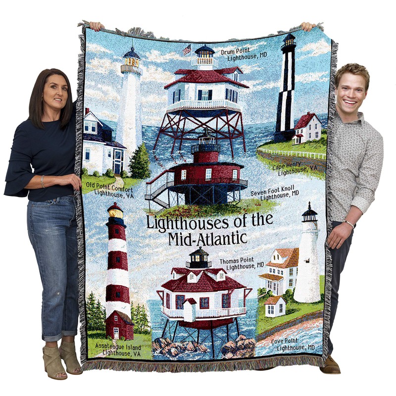 Pure Country Weavers Lighthouses of The Mid-Atlantic - Old Point, Drum Point, Seven Foot, Cape Henry, Assateague, Thomas Point, Cove Point - Blanket Throw Woven from Cotton - Made in The USA (72x54)