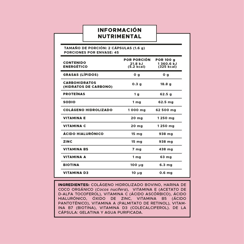 - Elaboradas con colágeno hidrolizado tipo 1 y 3 de origen bovino, cada porción te aporta 1000 mg de colágeno además de estar adicionadas con ácido hialurónico