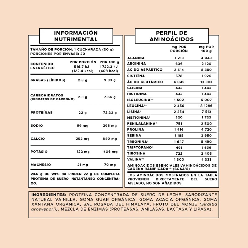 600g de proteína de suero de leche en cada envase, suficiente para varias dosis.