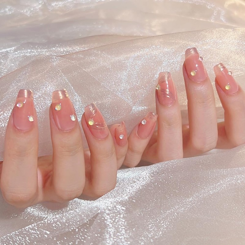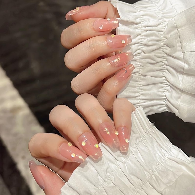 Pure Handmade Nails Press on Nail Reusable Fake Nails Gold Ribbon Aurora Beads Bling Bling Nude Medium Stick on Nails French Tip False Nails 10pcs (S, Q267)