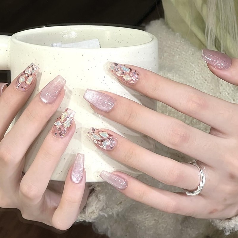 Pure Handmade Nails Press on Nail Reusable Fake Nails Pink&Purple Cat'sEye Rhinestones Bling Bling Nude Medium Stick on Nails French Tip False Nails 10pcs (L, Q268)